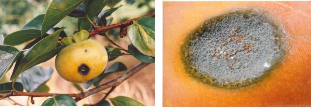 감나무 잿빛곰팡이병은 어린 잎과 과실에 발생하는 질병으로, 잎에서는 가장자리에서부터 겹무늬 증상으로 말라 들어가며, 진행되면 회색의 분생포자가 많이 형성됩니다. 심한 경우에는 잎이 말라죽거나 일찍 떨어질 수 있습니다. 어린 과실에서는 처음에 매달려 있던 꽃이 감염되어 꽃이 썩으면서 떨어지며, 과실표면에 흑색의 작은 점무늬가 형성됩니다. 진행되면 회색의 분생포자가 형성되면서 과실이 부패합니다.