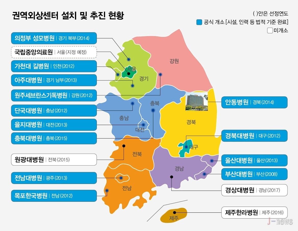 한국의 보건복지부는 국내 병원 중에서 특별히 권역외상센터로 지정하여 운영하고 있습니다. 이런 센터는 2012년 응급의료에 관한 법률 개정을 통해 시작되었고, 지금까지 꾸준히 확장되고 있습니다. 특히 2017년 기준으로 17개의 외상센터가 지정되어 있어 외상 사망률을 낮추는 데 기여하고 있습니다.