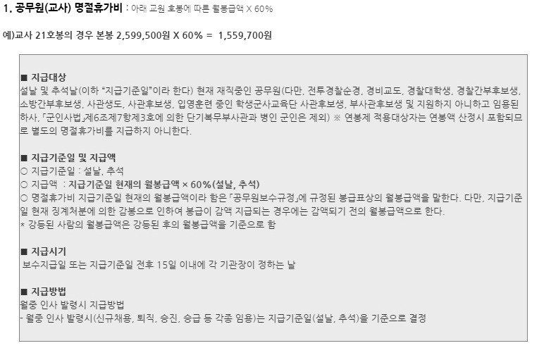 아무튼 경찰, 군인 명절휴가비 교사 명절휴가비의 지급액은 월 봉급의 60%를 년 2회 지급합니다.