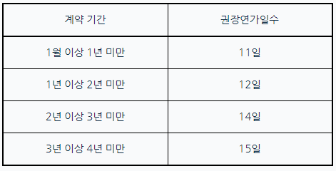 2018년부터는 11년 미만은 11일로, 2년 미만은 12일... 과 같이 개정되었습니다.