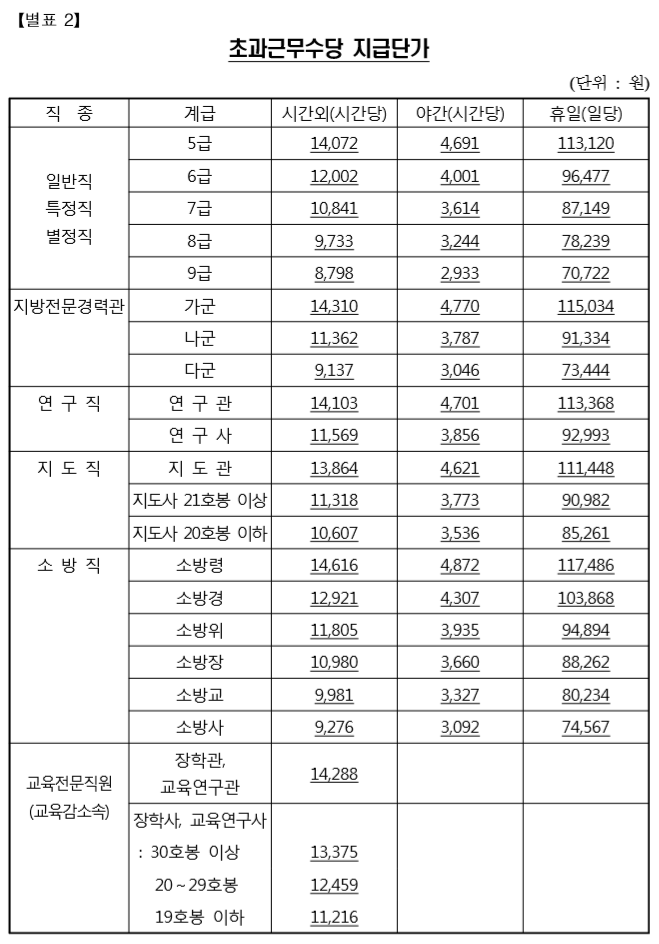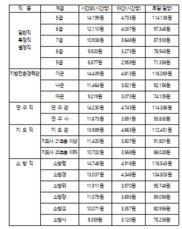공안직 공무원 시간외근무수당, 연구직 공무원 초과근무수당은 위와 같습니다