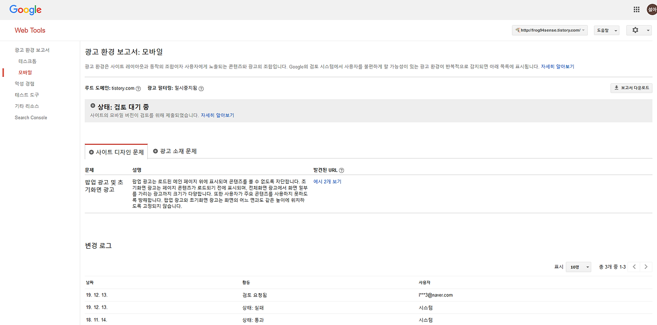 보려면 https://www.google.com/webmasters/tools/ad-experience-mobile?hl=ko 으로 들어가야 한다.