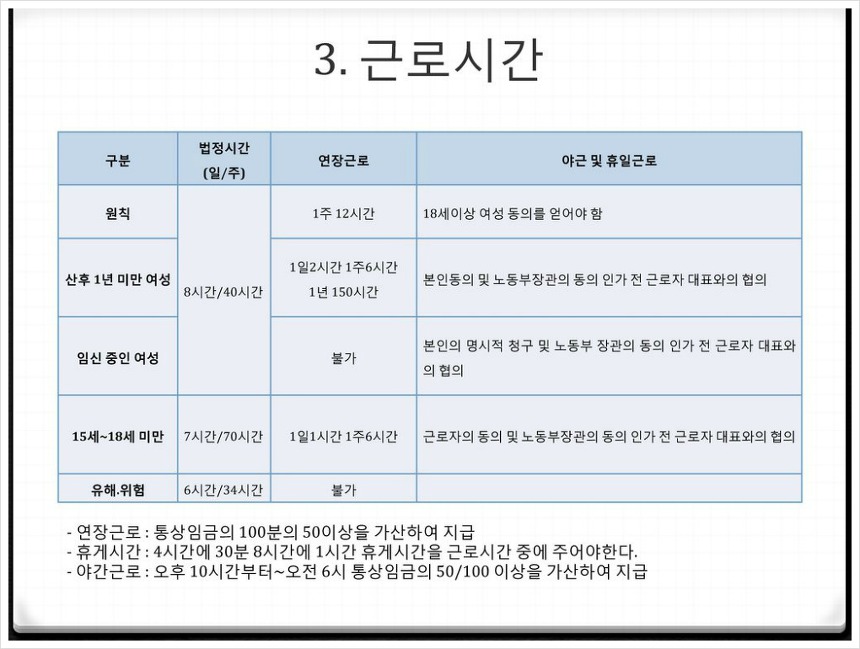 이 12시간의 연장시간이 더해져서 일주일에 52시간 이상은 노동을 못하도록 법으로 정한 것입니다.