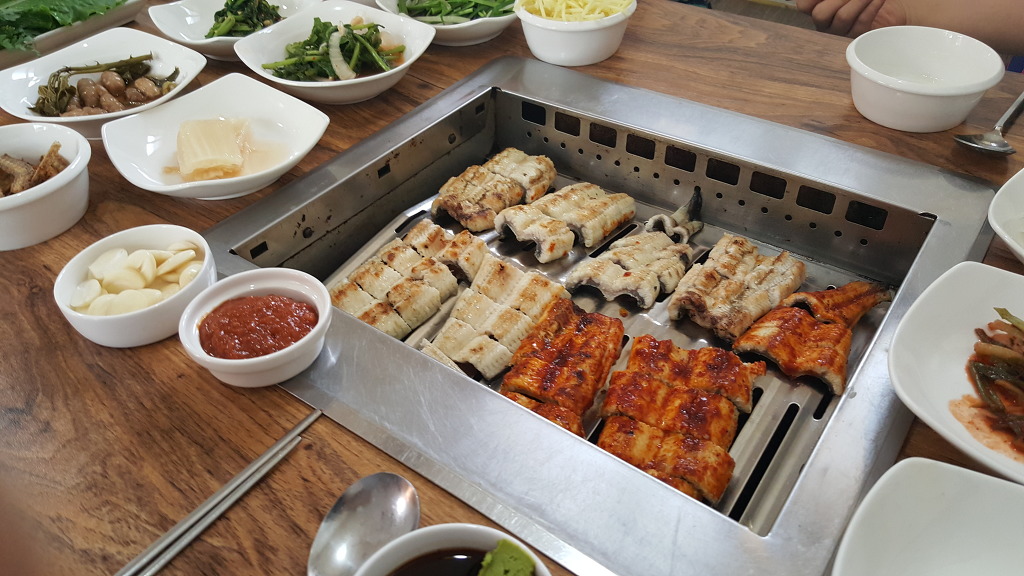 장모님의 묘소 주변을 돌아보니 관목에 덩굴이 자라고 있었고, 그 모습을 바라보던 아내는 슬픔을 추스리고 나서 배가 고프다는 이야기를 했다. 당진에는 유명한 먹거리가 두 가지가 있는데, 바로 우렁쌈밥과 장어구이다. 우렁쌈밥은 '우렁박사'라는 식당이 유명하지만, 그곳의 음식이 제 입맛에는 맞지 않아 장어구이를 먹어보러 가기로 결정했다.