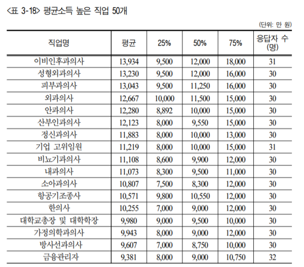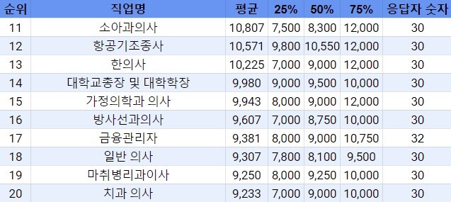 - 의료 분야의 연봉이 높음: 1위부터 10위까지 대부분이 의사입니다. 특히 성형외과의사, 한의사 등은 연봉이 상당히 높은 편입니다.