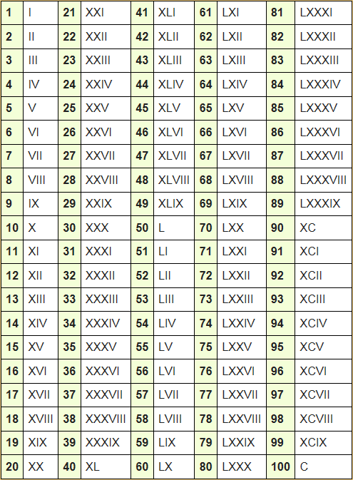 로마 숫자들은 라틴어로 발음은 위의 단어들로 발음하지만, 로마숫자의 표기는 흔히 우리가 익히 아는 바와 같이 아래처럼 표기한다.