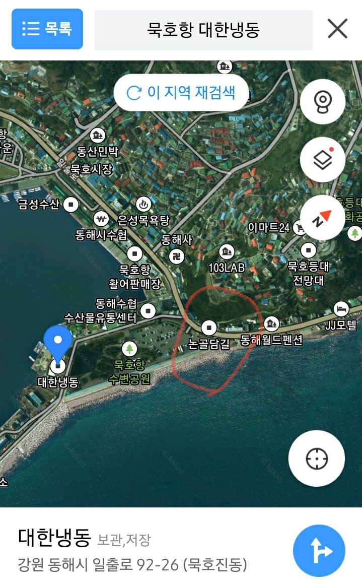 묵호항 대한 냉동을 지도에서 찾아서 바닷가를 기준으로 화면 뷰를 대략 돌려보면...