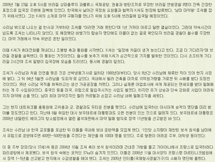 이런 어마어마한 마약왕임에도 불구하고 수리남 마약왕 조봉행은 1심에서 징역 10년을 선고받았다는 기사만 나온 것을 보니, 항소 상고를 통해서 감형을 받았을 테고... 이미 출소를 했을지도 모른다.