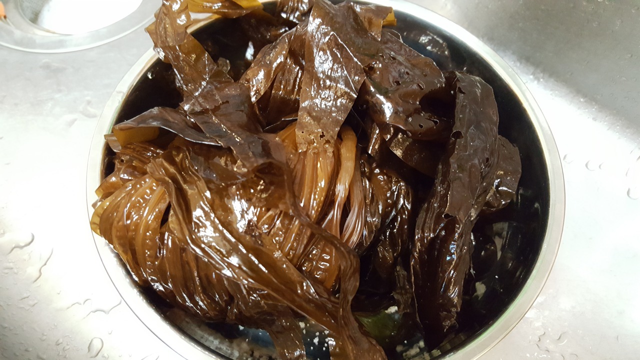 - 물미역을 흐르는 물에 깨끗이 씻습니다.