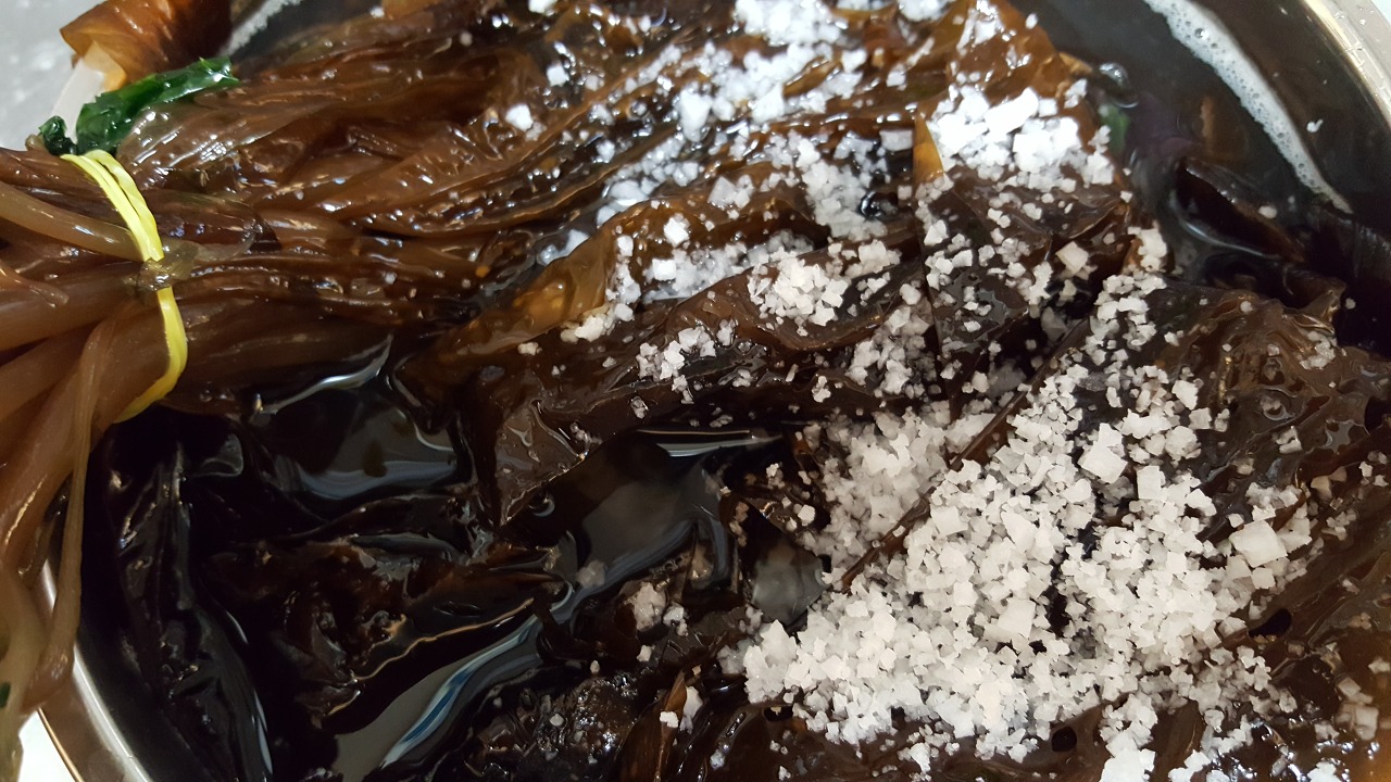 - 물미역을 소금물에 담가 10분 정도 두었다가 헹구면 끈적임이 제거되고, 비린내가 줄어듭니다.