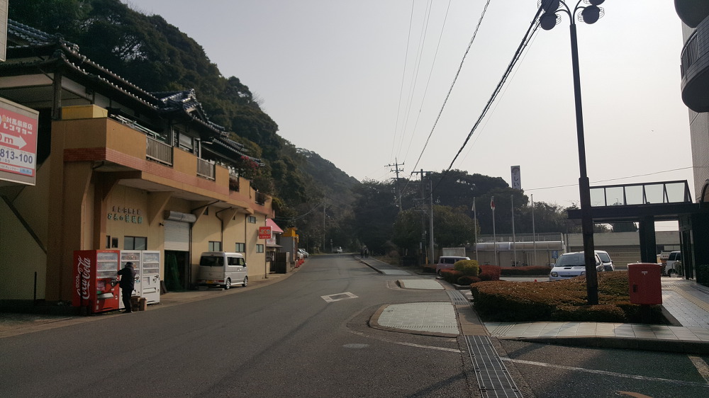 이즈하라항 바로 앞 풍경. 대마도 항구의 주차장은 협소합니다만 길건너편의 노란 건물이 제가 렌트한 렌트카 회사인 히토쯔바타고 렌터카 회사입니다.
