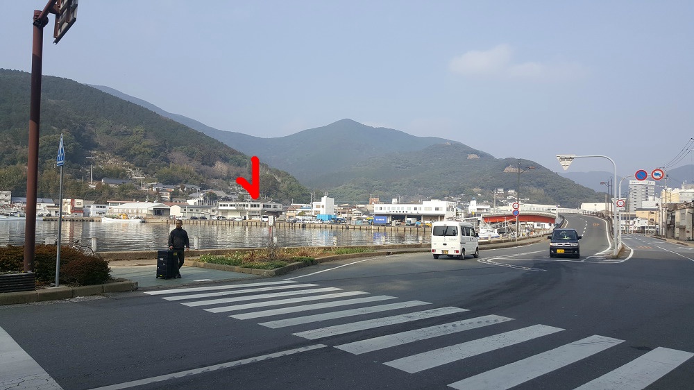 이즈하라항 바로 앞 풍경. 대마도 항구의 주차장은 협소합니다만 길건너편의 노란 건물이 제가 렌트한 렌트카 회사인 히토쯔바타고 렌터카 회사입니다.