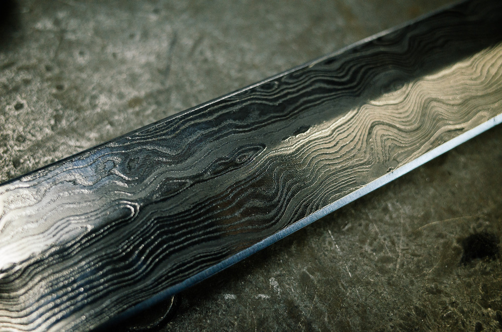 쇠가 접히고 접혔는데, 날카롭게 쐐기 모양으로 연마를 하다 보니, 접힌 쇠들이 저렇게 오묘한 무늬를 띤 것이다.