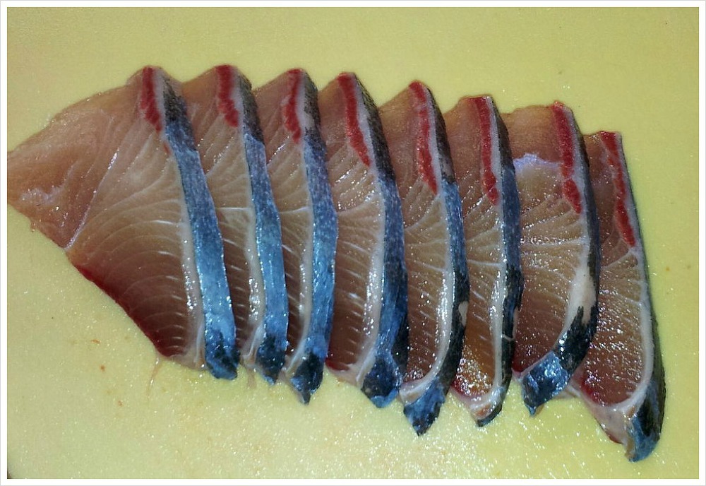 전체적으로 방어 생선살은 어두운 색을 띱니다.