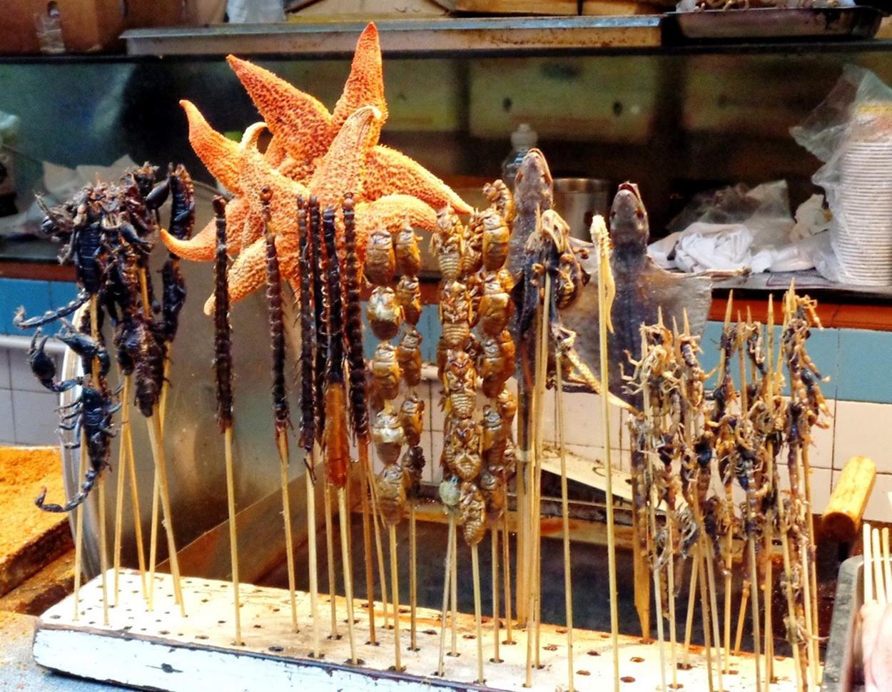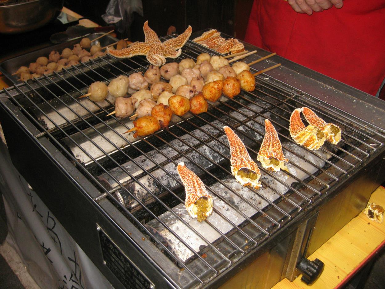 중국 칭다오를 비롯한 시장 가판대에서 불가사리 튀김 꼬치를 많이 팔고 있습니다.