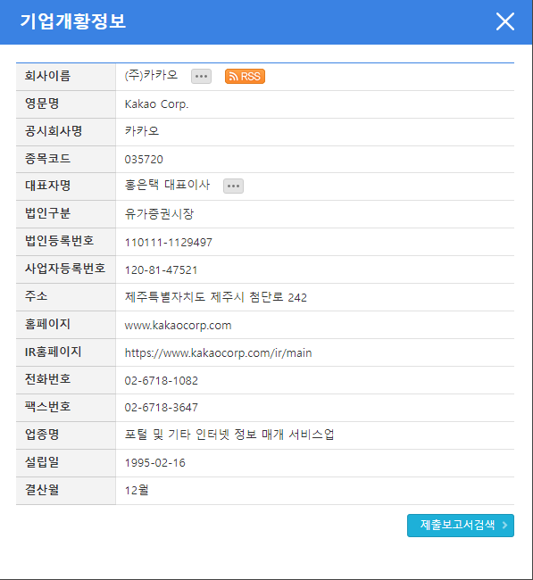 카카오를 검색하면 종목코드 035720로 나타나며, 대표자는 홍은택 대표이사입니다. 법인번호와 사업자등록번호도 확인할 수 있으며, 주소지는 제주도입니다. 이를 통해 카카오의 사업자 정보를 정확하게 확인할 수 있습니다.