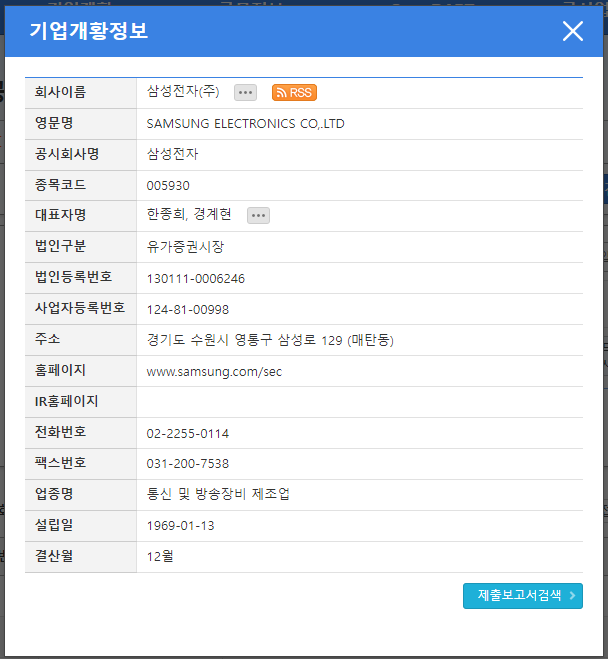 삼성전자를 검색하면 공시대상회사로 나오며, 팝업으로 "기업개황정보"가 나타납니다. 이 중에 사업자등록번호, 법인등록번호, 전화번호, 영문 회사명, 주식 종목코드 등의 정보를 확인할 수 있습니다.