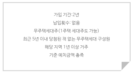가입기간 2년, 납입 횟수 24회, 무주택 세대주(1 주택 세대주도 가능), 과거 5년 내 다른 주택에 당첨된 적이 없는 무주택 세대 구성원이며 해당 지역 1년 이상 거주하고 '기준 예치금액 충족'조건이 추가로 붙는다. - 그 외 지역 1순위 조건: