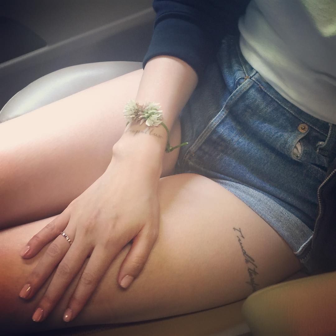 허벅지에 레터링 타투가 맞군요.