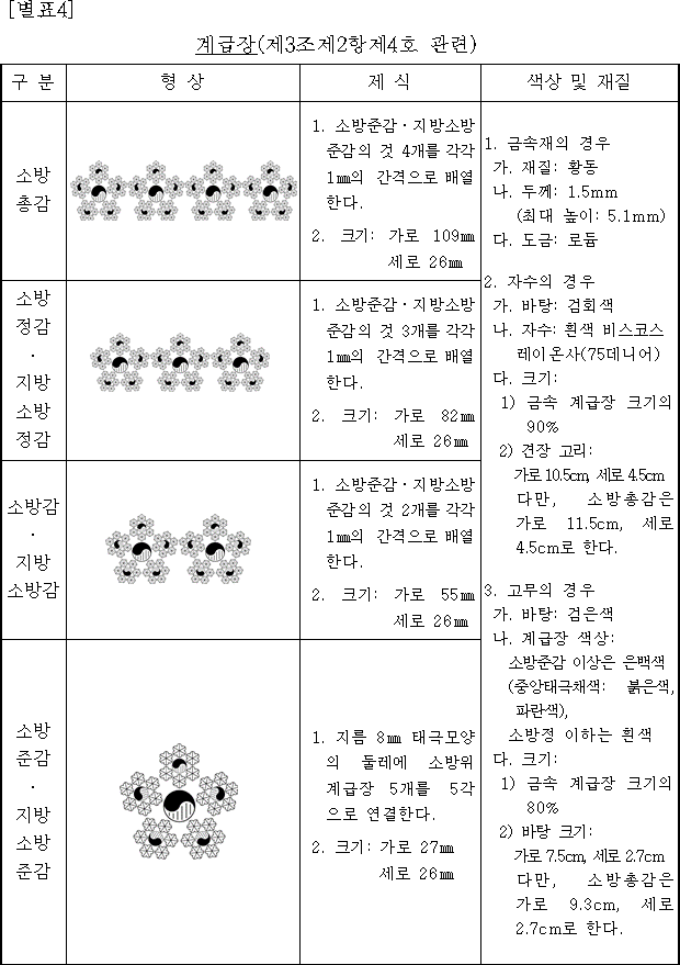• 태극문양과 별의 개수는 소방위부터 소방총감까지의 계급을 상징합니다. 소방위는 태극문양 1개, 소방경은 2개, 소방령은 3개, 소방정은 4개를 가집니다. 소방준감부터 소방총감까지는 태극문양 4개에 별이 추가되어 각 계급을 구분합니다.