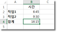 =B2+B3을 입력하고 Enter 키를 누릅니다. - 결과로 16시간 15분이 나타납니다.