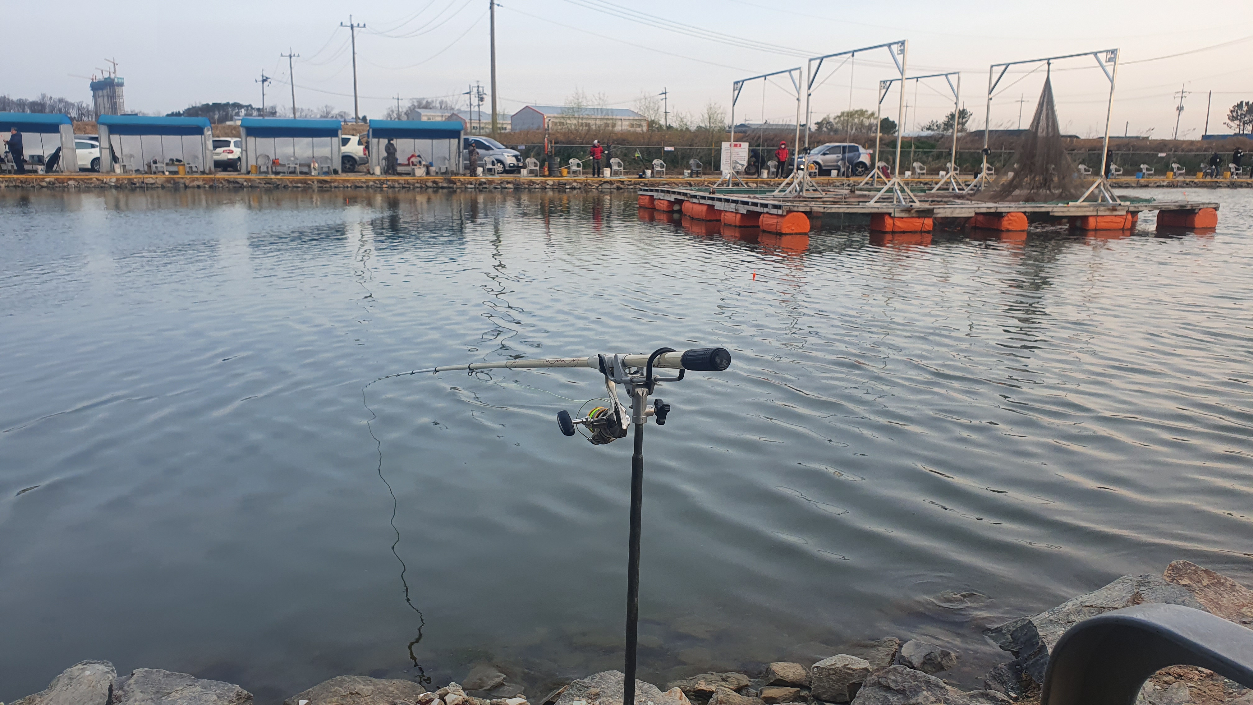 정성바다낚시터에서의 우럭 낚시는 특히 가까운 가두리 구역을 공략하는 것이 핵심입니다. 이날은 A 가두리를 공략하려 했으나 이미 다른 조사님들이 자리하고 있어, C 가두리로 포인트를 변경했습니다. C 가두리는 매우 짧은 거리로, 툭 치면 바로 가두리를 공략할 수 있는 곳이었지만 낮 동안에는 바람의 영향으로 찌가 잘 들어가지 않았습니다.