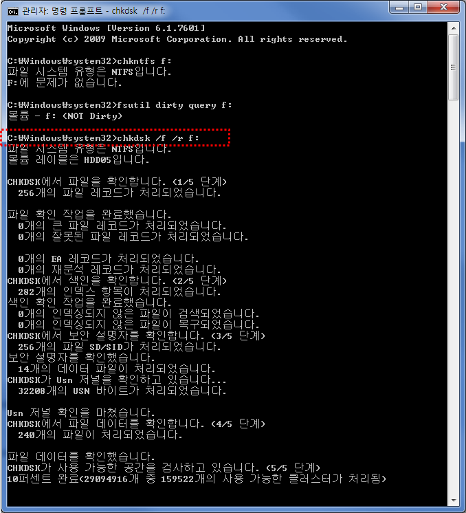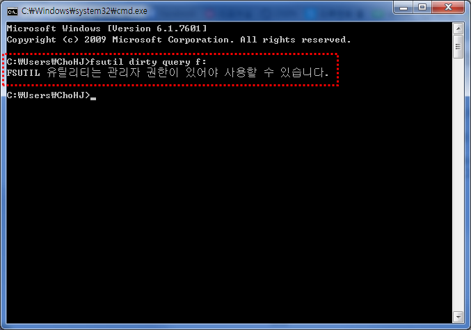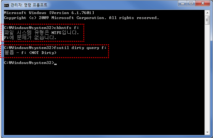 fsutil dirty query 드라이브:명령어를 사용하여 Dirty Bit 상태를 확인할 수 있습니다. 이 명령어는 Windows XP에서 사용되지만, Windows 7에서는chkntfs명령어로도 확인이 가능합니다.