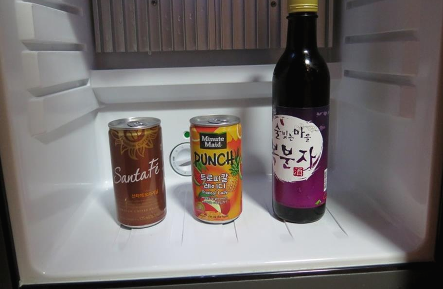 기본적으로 제공되는 미니바? 음료들 캔커피, 주스, 그리고 놀랍게도 무안의 무인텔들은 복분자주 한 병씩을 넣어두고 있다.