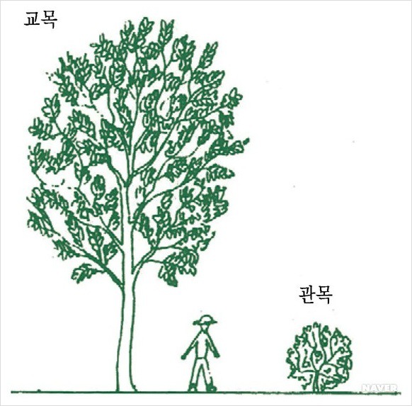 관목은 보통 2m 이하의 나무를 뜻하고 교목은 8m가 넘게 자라는 나무를 뜻한다.