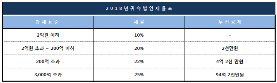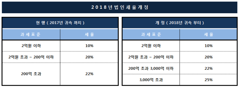 법인세율은 2018년에 개정되어서 3000억 초과 구간에 대해 25%가 신설되었습니다.