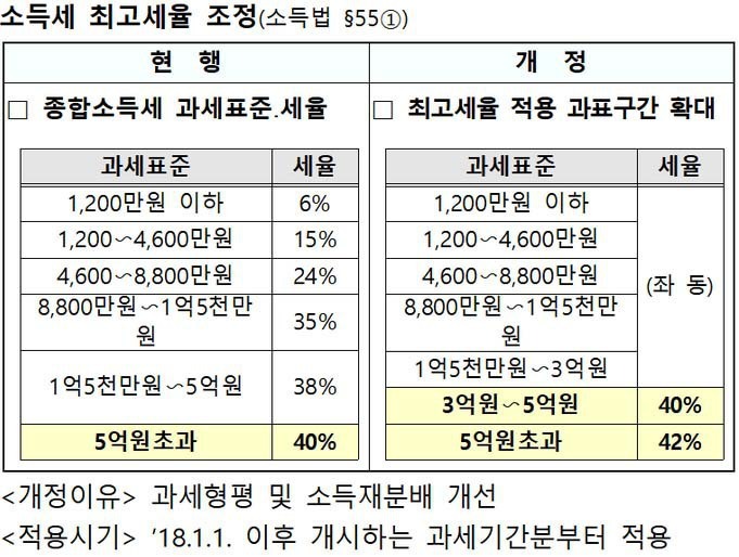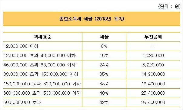 하지만 2018년 종합소득세 세율은 5억 초과 소득에 대해서는 42% 납부 구간이 신설되었습니다.