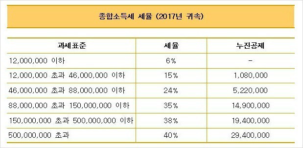 2017년까지 종합소득세율은 최고 세율이 40% 까지였습니다.