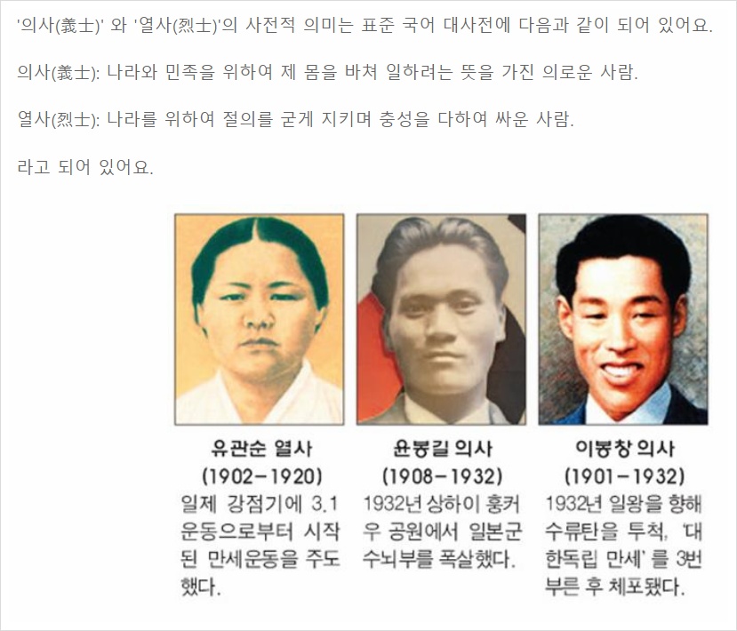 윤봉길 의사 얘기가 나와서 말인데, 도대체 의사는 뭐고 열사는 뭐란 말이죠?