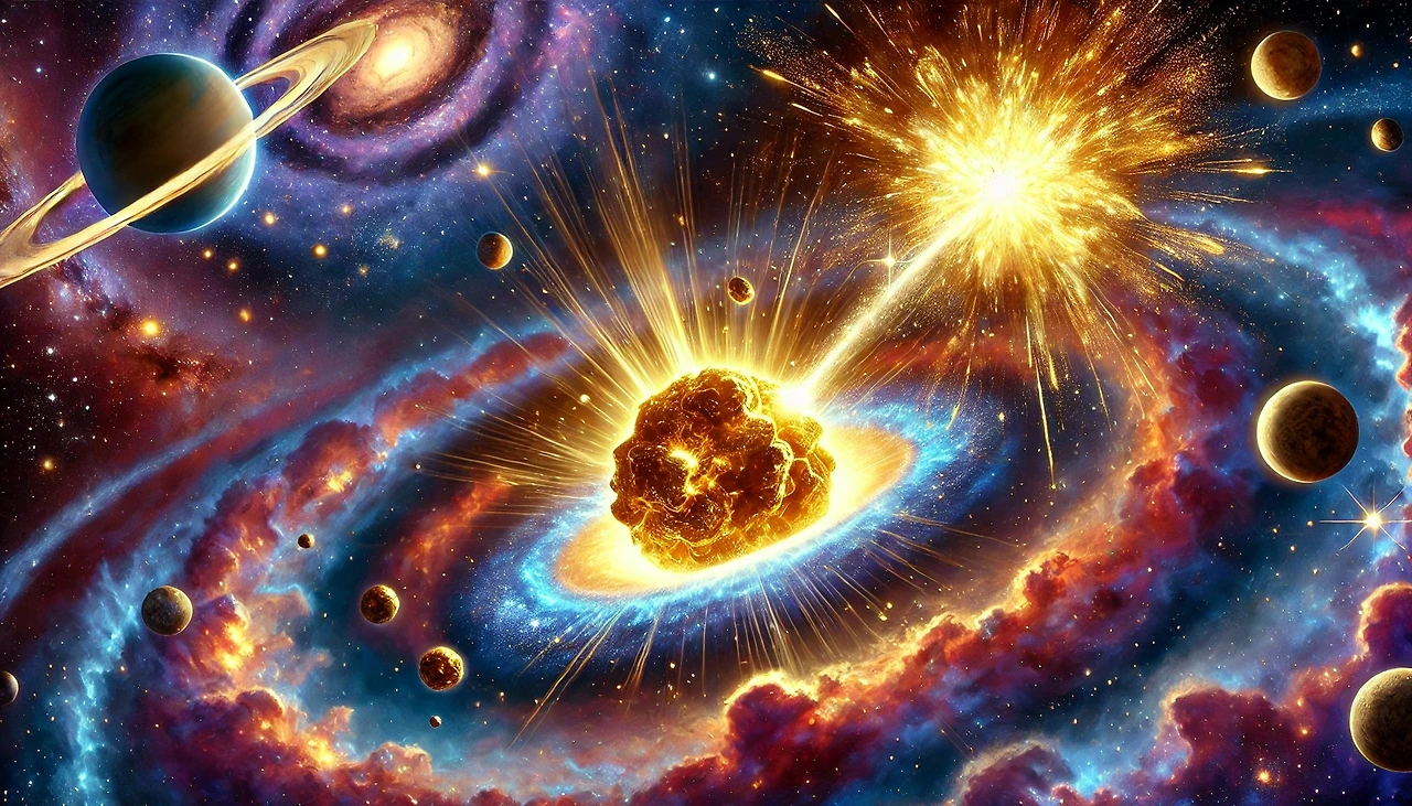 초신성 폭발 동안, 엄청난 양의 에너지가 방출되며, 고속으로 움직이는 중성자들이 기존 원소들과 충돌하면서 새로운 원소를 형성합니다. 이를 '급속 중성자 포획 과정(r-과정)'이라고 부르는데, 이 과정에서 금과 같은 무거운 원소들이 만들어집니다. 이후 초신성 폭발로 인해 생성된 금과 다른 무거운 원소들은 우주 공간으로 퍼지며, 차후 형성되는 행성이나 소행성에 포함될 수 있습니다.