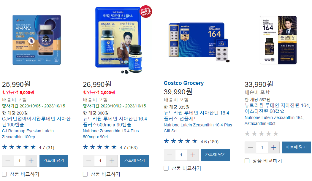 코스트코에서 구매할 수 있는 아이시안 루테인 지아잔틴(CJ Returnup Eyesian Lutein Zeaxanthin 100cp)과 뉴트리원 루테인 지아잔틴 16:4는 눈 건강에 좋은 건강기능식품으로 알려져 있습니다. 이 두 제품은 루테인과 지아잔틴이라는 눈 건강에 이로운 성분을 함유하고 있습니다. 특히, 10월에는 코스트코 온라인에서 아이시안 루테인 지아잔틴이 5천 원 할인된 가격에 판매되고 있어, 많은 관심을 받고 있습니다.