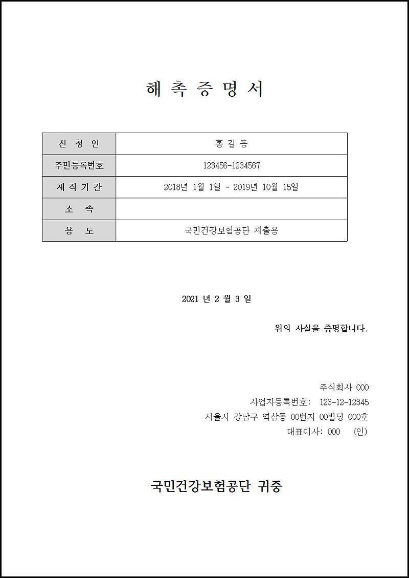 - 해촉증명서를 제출하지 않으면 건강보험료 정산이 잘못되어 소급 정산을 받을 수 있습니다.
