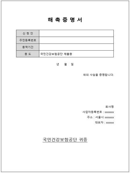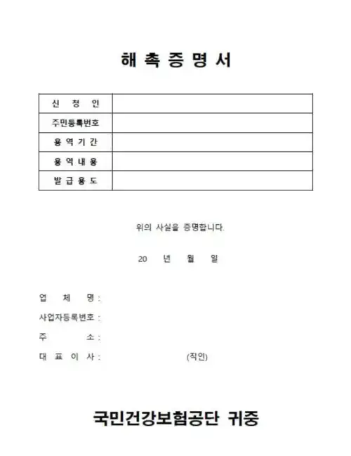 해촉증명서 양식은 이전 직장에서 제공하는 양식을 사용하거나, 필요한 경우 아래 첨부된 한글, 엑셀, 워드 파일을 다운로드하여 사용할 수 있습니다. 이 서류는 본인의 건강보험료 납부 상태에 큰 영향을 미칠 수 있으므로, 정확하게 작성하고 제출하는 것이 중요합니다.