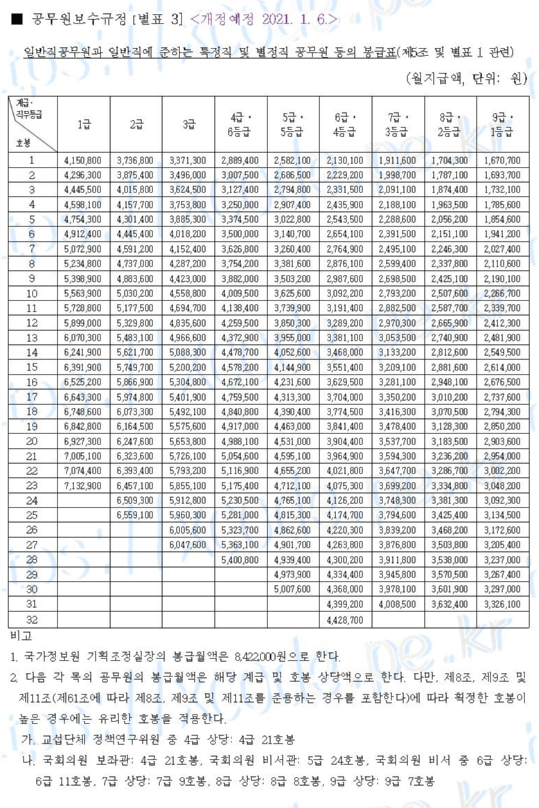 아래는 2020년 일반직공무원 봉급표와 2021년 공무원 임금인상을 예상한 표다.