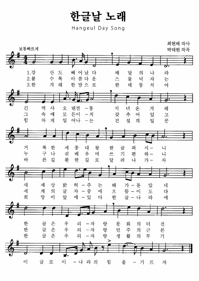 한글날을 기념할 때쯤 되면 또 궁금해하는 게 바로 한글날 기념일 노래. 한글날 노래 가사와 악보를 올려둔다.