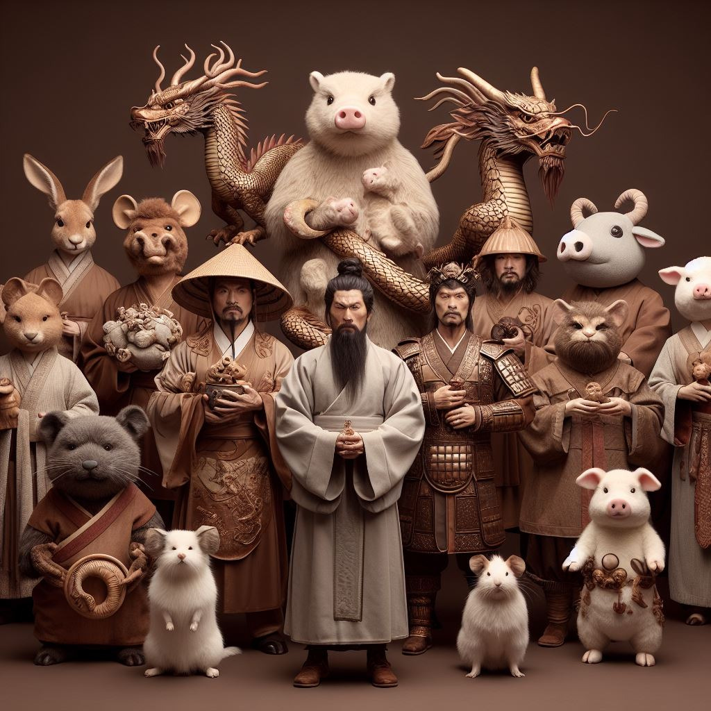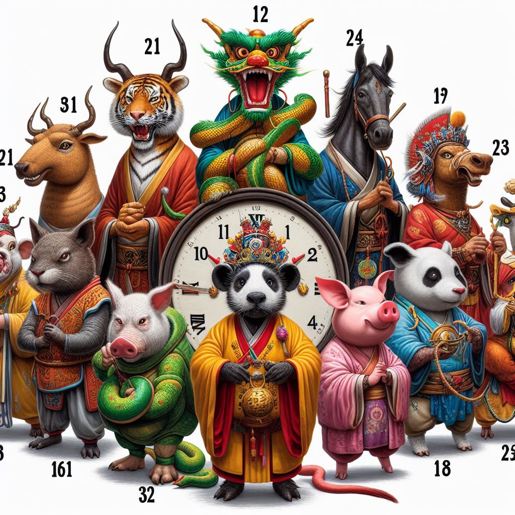 쥐, 소, 호랑이, 토끼, 용, 뱀, 말, 양, 원숭이, 닭, 개, 돼지 12지신이 고대 중국 신화속 복장을 하고 코믹스러운 모습으로 시계의 12시간에 맞춰서 배치된 모습, 자연스러운 사진, 브라운톤
