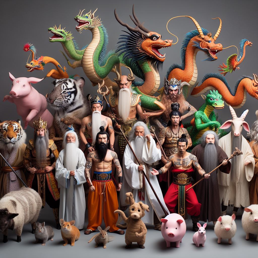 중국의 신화에서 12간지는 동물들의 순위를 정하는 신비로운 이야기로 시작됩니다. 옛날 옛적에 신이 동물들의 순위를 정하기 위해 달리기 시합을 열었다고 전해집니다. 달리기 경주가 시작되고, 부지런한 소가 가장 먼저 출발하여 1등으로 도착했습니다. 그러나 소의 머리 위에 올라탔던 쥐가 도착점에서 뛰어내리는 바람에 쥐가 1등, 소가 2등이 되었다고 합니다. 이후에는 순서대로 호랑이, 토끼, 용, 뱀, 말, 양, 원숭이, 닭, 개, 그리고 돼지가 들어와서 현재의 순서가 정해졌습니다.