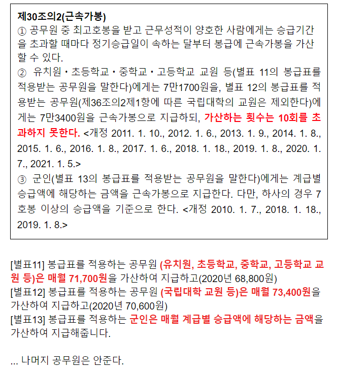 근속 가봉은 교육공무원에게만 적용되는 것은 아닙니다. 군인도 일반 공무원도 호봉표를 넘어서는 호봉에서는 근속 가봉을 적용할 수 있습니다.