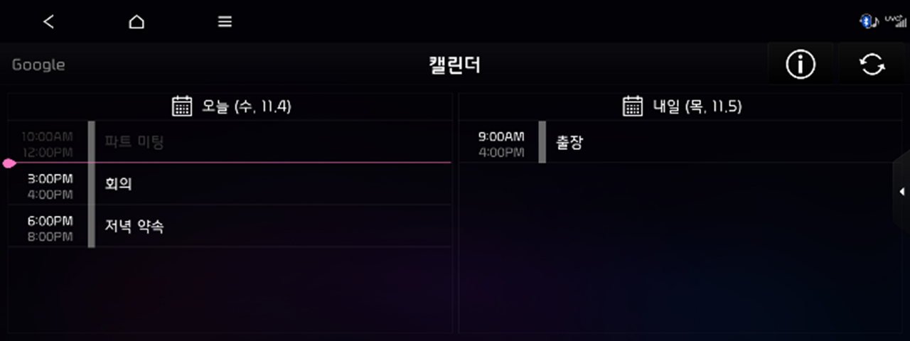 스마트폰 앱에서 개인의 Google 캘린더 또는 iCloud 캘린더와 연동하시면 차량에서 오늘과 내일의 일정을 확인할 수 있다.