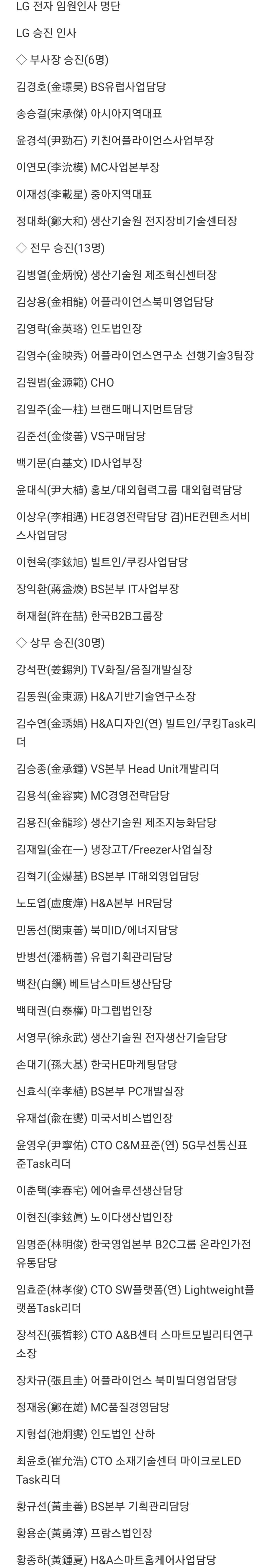 다음은 삼성전자의 가전 라이벌인 엘지전자의 2020 LG전자 임원인사 명단이다.