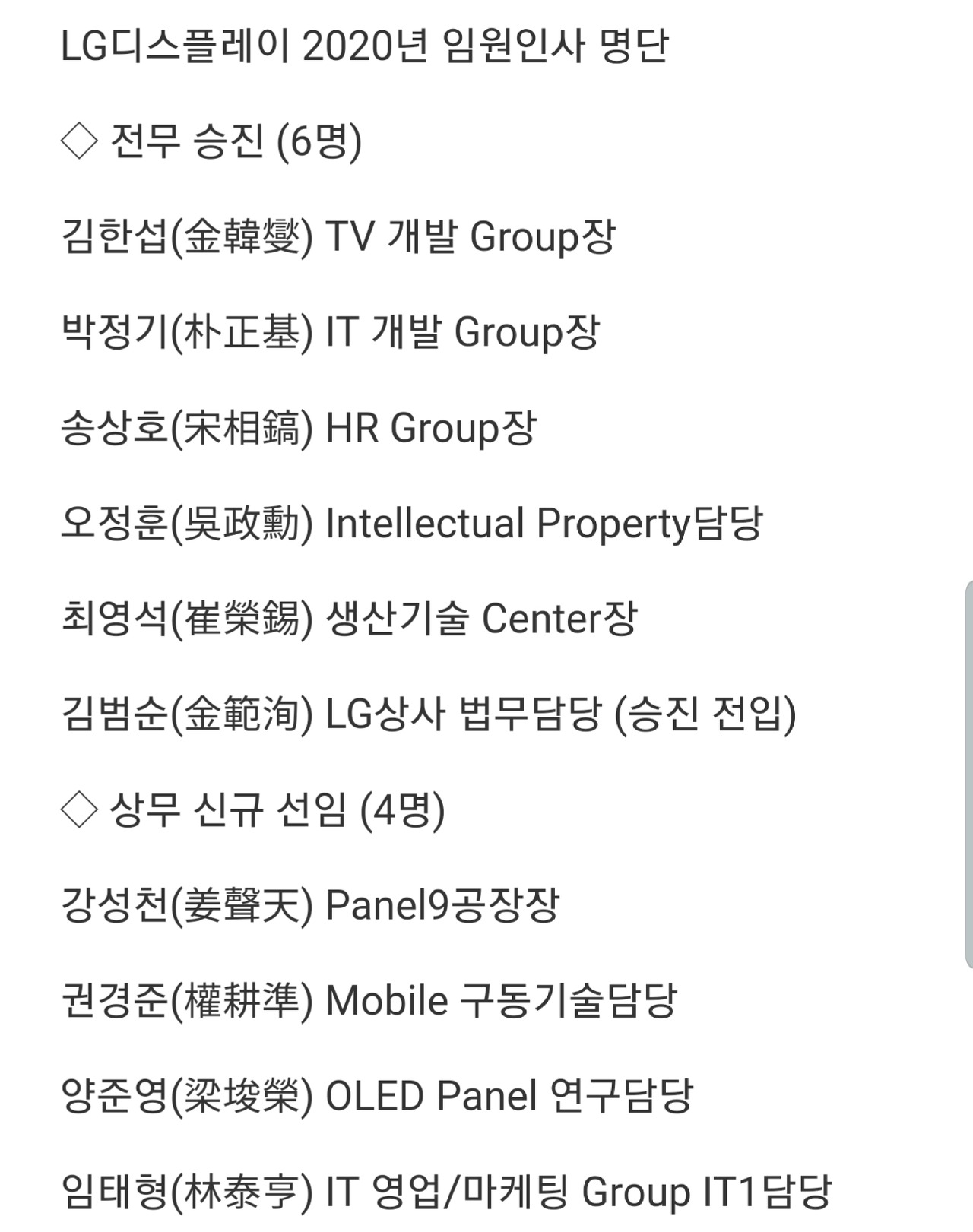 2020 엘지 디스플레이 승진 인사 명단이다.