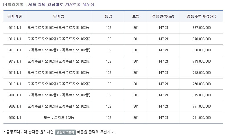 2005년 1월1일 자료부터 2018년 1월 1일 기준의 공시 가격까지 잘 나와 있습니다.
