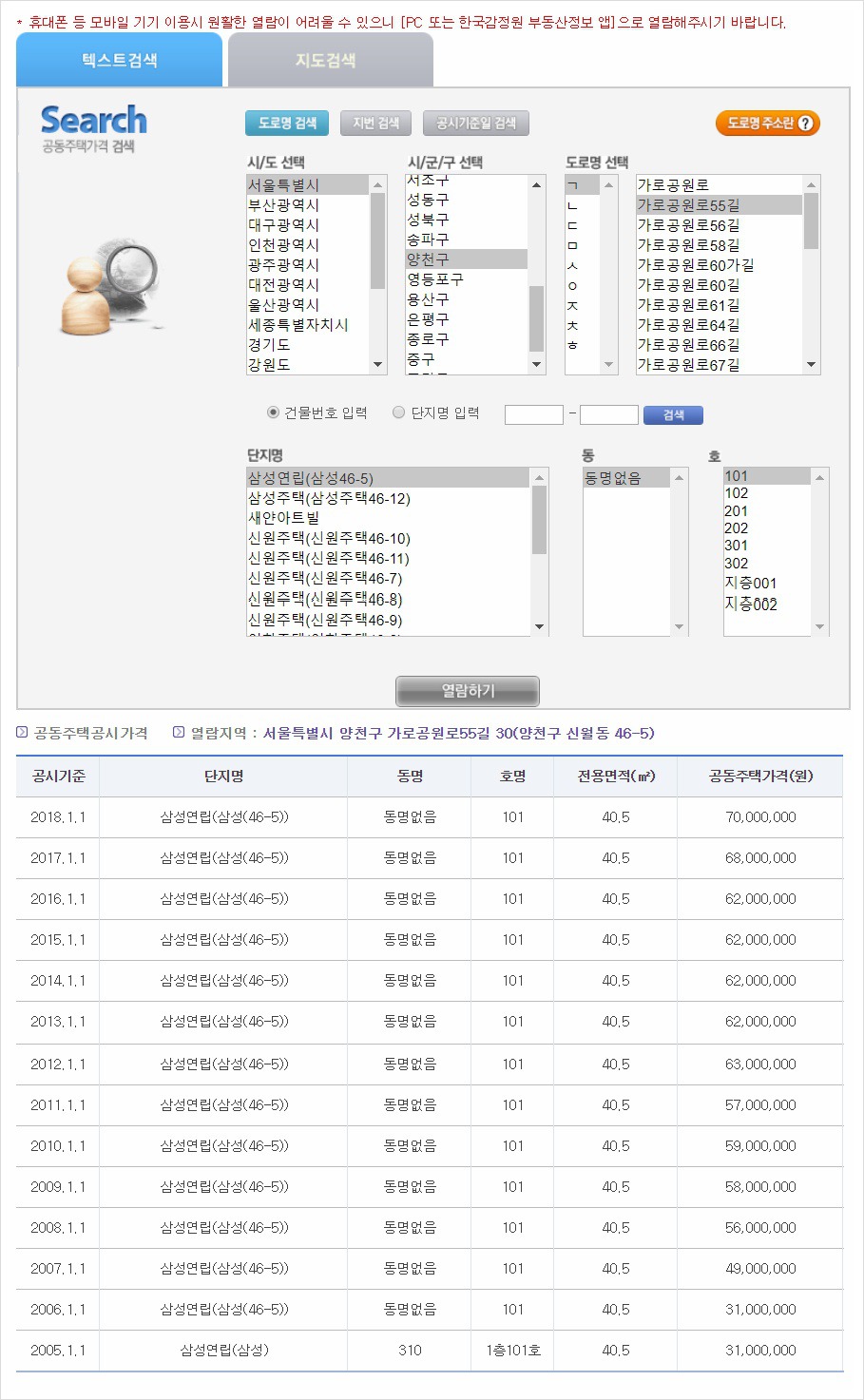 서울특별시 양천구 가로공원 55길 삼성연립 101호의 공동주택 공시 가격을 알아보았습니다.