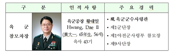 • 황대일 중장: 육군 군수사령관 → 육군 참모차장