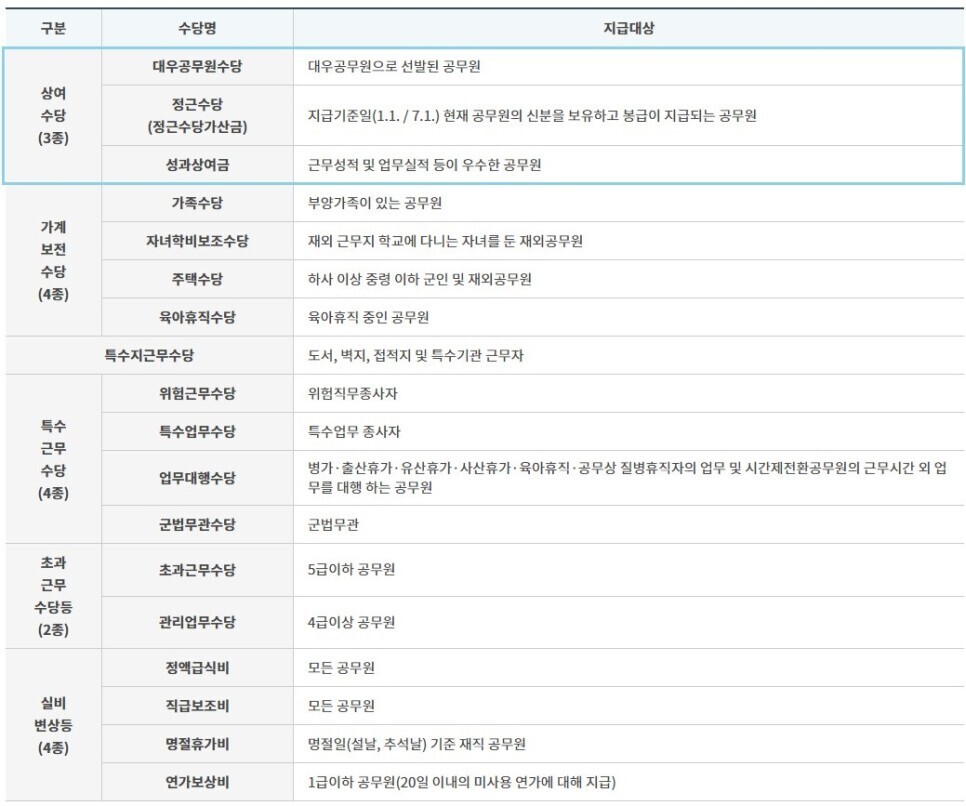 수당에는 다양한 종류가 있으며, 상여수당으로는 대우공무원수당, 정근수당(정근수당가산금), 성과상여금이 포함됩니다. 가계보전수당에는 가족수당, 자녀학비보조수당(이건 국내 공무원에게는 해당이 없습니다. 재외공무원용입니다.), 주택수당(하사이상 중령이하 군인과 재외공관원에게만 해당하는 수당입니다.), 육아휴직수당 등이 있습니다.