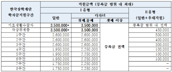 이 등록금 지원의 자격은 가족의 소득분위에 따라 결정됩니다. 소득분위 시스템은 가구의 소득 수준을 분류합니다. 2023년에는 소득분위 기준이 개정되어 더 많은 가정이 혜택을 받을 수 있게 되었습니다. 소득분위 기준은 가구 크기에 따라 다르며, 네 명, 다섯 명, 여섯 명 가정의 구체적인 기준이 있습니다.
